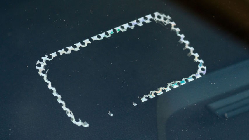 Gdy klej został już należycie rozgrzany, należy jak najszybciej podważyć naklejkę i zerwać ją. Aby ułatwić sobie pracę i zminimalizować pozostałości, można użyć skrobaczki do szyb, choć lepiej do tego zadania nada się żyletka lub nożyk do tapet, z którego należy wyjąć całe ostrze. Ostrożnie, choć pewnie, starajmy się wprowadzić i przesunąć ostrze pod naklejką, oddzielając ją od szyby i zapobiegając rozwarstwianiu. Przy odpowiedniej temperaturze i odrobinie szczęścia na szybie pozostanie niewielka ilość kleju. Jeżeli tak się stanie, nie szorujmy szyby ostrzem, ponieważ możemy zostawić na niej zauważalne rysy. Pozostałości kleju możemy pozbyć się, używając mniej inwazyjnych sposobów.