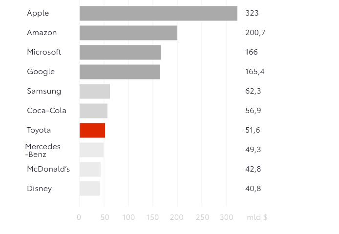 W najnowszym rankingu najcenniejszych marek świata przygotowanym przez opiniotwórczy magazyn Forbes Toyota nieustannie zajmuje najwyższą lokatę w branży motoryzacyjnej, a w ogólnym zestawieniu uplasowała się na 11. miejscu pośród takich firm, jak Apple, Google, Microsoft czy Amazon.